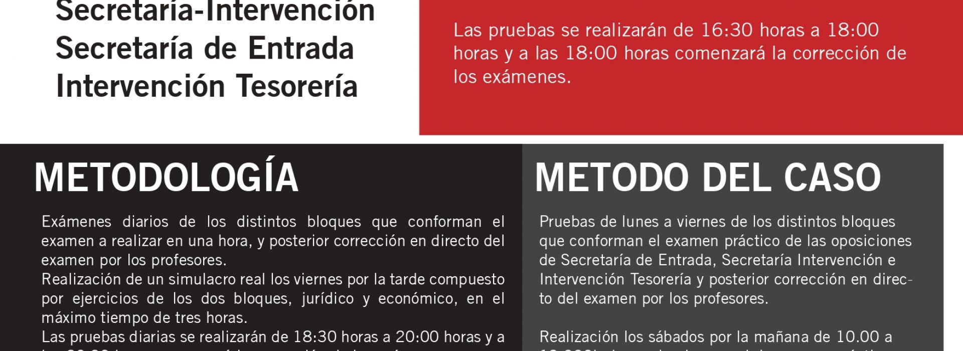 El curso intensivo incluye sesiones diarias de ejercicios de las materias a examen que se realizarán de 18:30 horas a 20:00 horas. A las 20:00 horas comenzará la corrección de los mismos por los profesores. Además, todos los sábados por la mañana de 10.00 a 13.000 h se realizará un simulacro real de examen práctico a resolver en el tiempo máximo de tres horas.